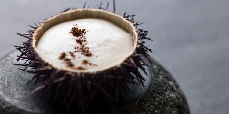 Componete il riccio mettendo un cucchiaino di polpa di riccio dentro il guscio, qualche crostino di pane sopra ed infine la spuma di mandorle sifonata, completate con la polvere di caffè.